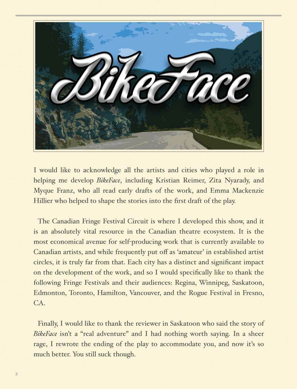 An E-book of the multi-award winning Toronto & Hamilton Fringe play BikeFace! An amazing two-wheeled adventure of Canadian proportions, spinning strange-but-true tales from a ride across the country!