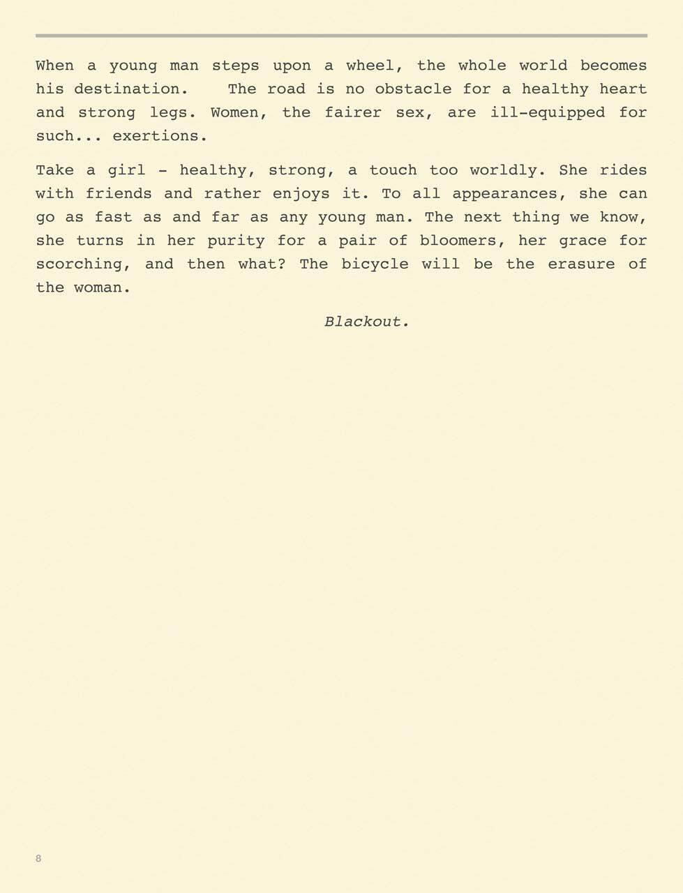 During the Victorian bicycle craze, medical professionals cautioned that while it is fine for a young, adventurous man to ‘take to the wheel’, if women should follow suit it would undoubtedly result in weakened hearts, epilepsy, exhaustion, appendicitis, dysentery, nervous attacks, insomnia, and physical injury. But deadliest of all was the condition called “bicycle face” - an over-exerted, wild-eyed feminine vulgarity with nothing before her but the wide open road. Over a century later, the Journal of Paediatric Psychology still finds that girls are four times more likely than boys to be warned about the dangers inherent in adventure and exploration. This is where BikeFace takes off, telling a story of “breaking gender stereotypes, bravery, endurance, camaraderie” (Life With More Cowbell) and why girls can be adventurers too.