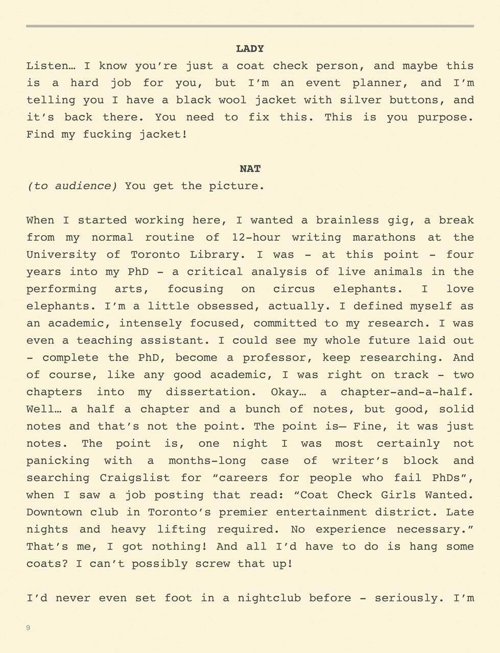 Black Wool Jacket spins true tales from a wild nightclub coat check. Meet Nat, bookish PhD student in desperate need of a side job. When the only gig she can find is checking jackets deep in the heart of Toronto's late-night entertainment district — far from her usual Friday nights at a library desk — Nat doesn’t expect to last long. But, behind a desk of a very different kind, Nat has front-row seats to the strangest show in town: the nightclub. Armed with an ear for eavesdropping, Nat’s nights at coat check write themselves into tales of passion, heartache, and maybe just a bit too much whiskey. From the unbelievable to the inconceivable, the hilarious to the unsavory, Black Wool Jacket retraces the stories that people share, when they think no one is listening or likely to remember in the morning.
