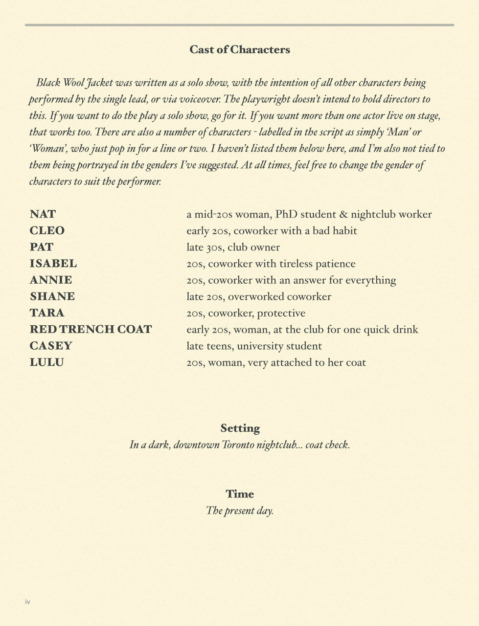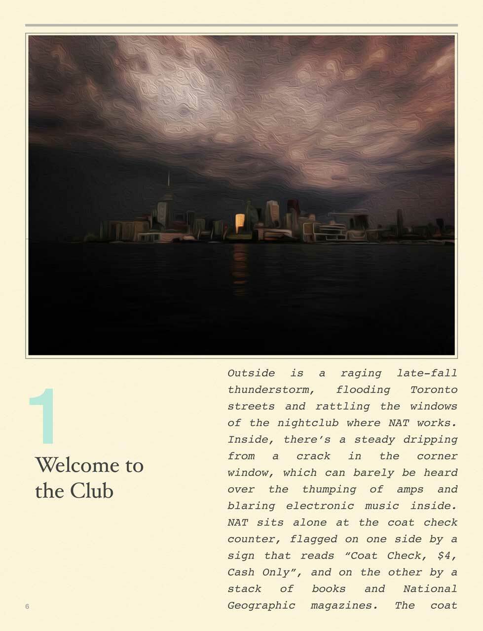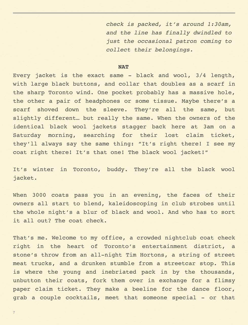 Black Wool Jacket spins true tales from a wild nightclub coat check. Meet Nat, bookish PhD student in desperate need of a side job. When the only gig she can find is checking jackets deep in the heart of Toronto's late-night entertainment district — far from her usual Friday nights at a library desk — Nat doesn’t expect to last long. But, behind a desk of a very different kind, Nat has front-row seats to the strangest show in town: the nightclub. Armed with an ear for eavesdropping, Nat’s nights at coat check write themselves into tales of passion, heartache, and maybe just a bit too much whiskey. From the unbelievable to the inconceivable, the hilarious to the unsavory, Black Wool Jacket retraces the stories that people share, when they think no one is listening or likely to remember in the morning.
